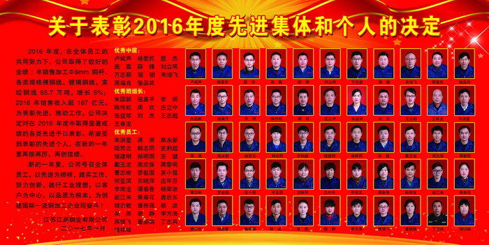 2016年度,在全體員工的共同努力下,公司取得了較好的業(yè)績:年銷售加工Φ8mm銅桿、各類規(guī)格裸銅線、鍍錫銅線、束絞銅線65.7萬噸,增長5%;2016年銷售收入超167億元。為表彰先進,推動工作,公司決定對在2016年度中取得顯著成績的各類先進予以表彰。希望受到表彰的先進個人,在新的一年里再接再厲,再創(chuàng)佳績。新的一年里,公司號召全體員工,以先進為榜樣,踏實工作、努力創(chuàng)新,踐行工業(yè)理想,以客戶為中心,以品質為根本,為創(chuàng)建國際一流銅加工企業(yè)而奮斗。優(yōu)秀中層:盧斌聲、楊愛民、殷 杰、施嘉、薛鋒、劉立明 萬志新、駱駿、朱培飛、蔣福良、駱品其 優(yōu)秀班組長:朱國新、駱康平、李 明、陳傳松、周 歡、莊立中 張益琴、劉 杰、王志超、王春龍 優(yōu)秀員工:朱洪星、蔣濤、高永新、陸蘇云、韓志同、史利超儲建明、楊明雨、宗健、戴玉龍、 高歡保、蔣黎明曹志彬、羅祖國、吳小強、何亞濱、宗曉萍、莊年芬李常龍、譚春香、楊榮波、趙江來、焦春花、唐后東 儲志敏、曾棟強、駱 波、吳燕、駱 靜、李方海 蔣銀飛、董麗娟、丁志兵、儲祥妹