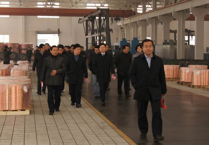 12月21日上午,在市長王中蘇的陪同下,寶應(yīng)縣黨政代表團來公司參觀考察。總經(jīng)理駱偉棟熱情接待了代表團一行,并介紹了公司的發(fā)展歷程和前景。代表團參觀了SCR銅桿車間、復(fù)合銅線車間、銅絞線車間。